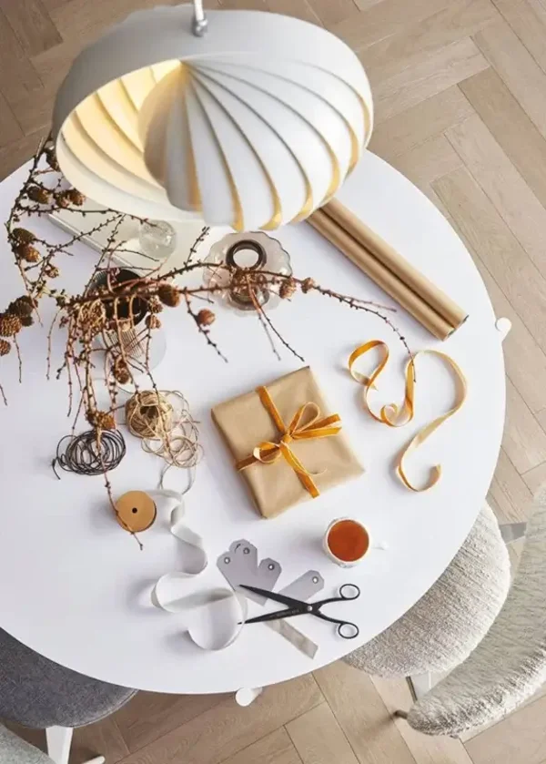 De lamellen van de armatuur zijn zo gerangschikt dat ze het licht zacht verspreiden en tegelijkertijd interessante schaduweffecten creëren.