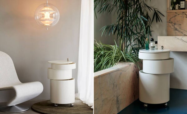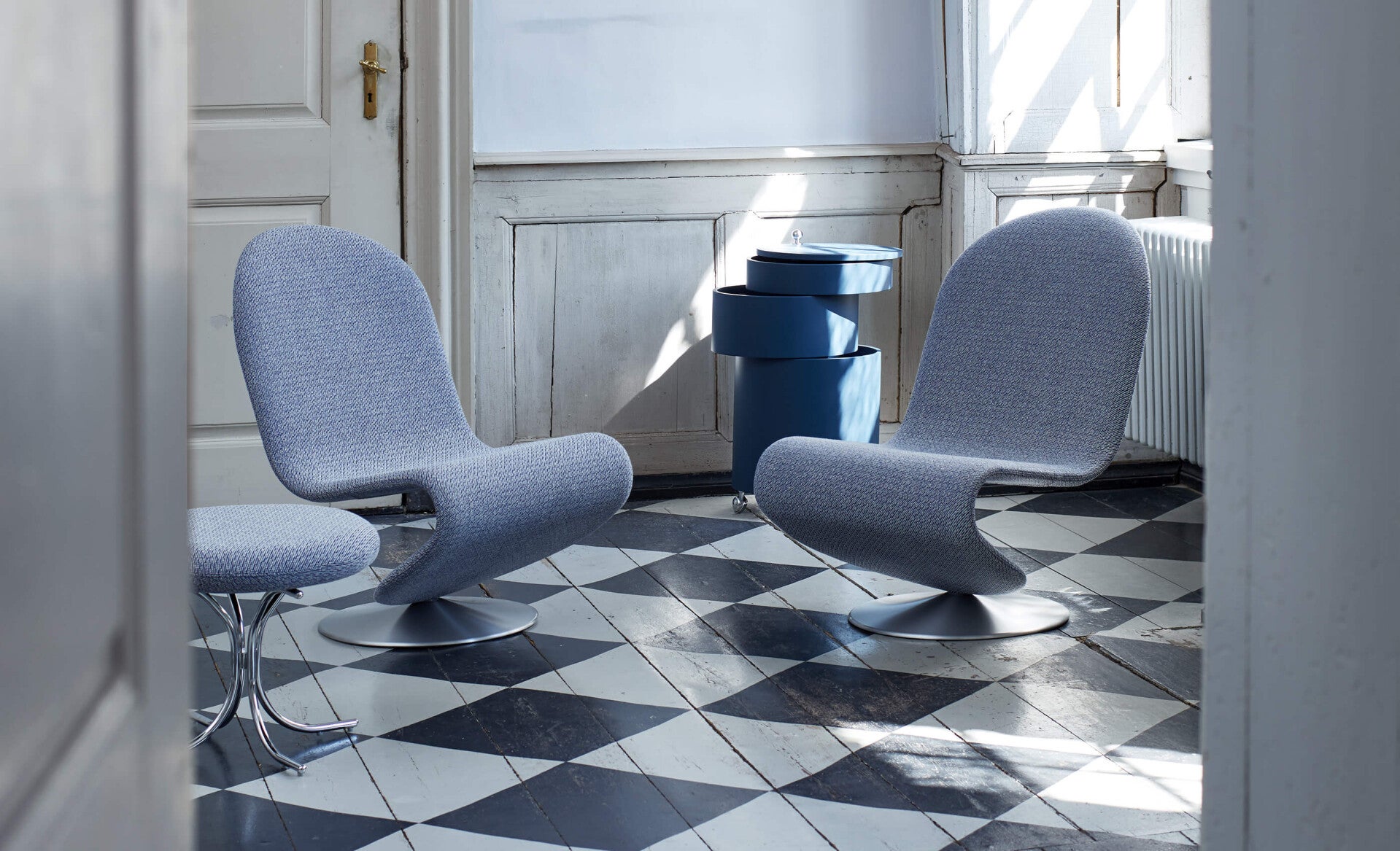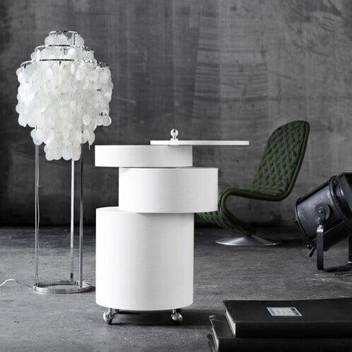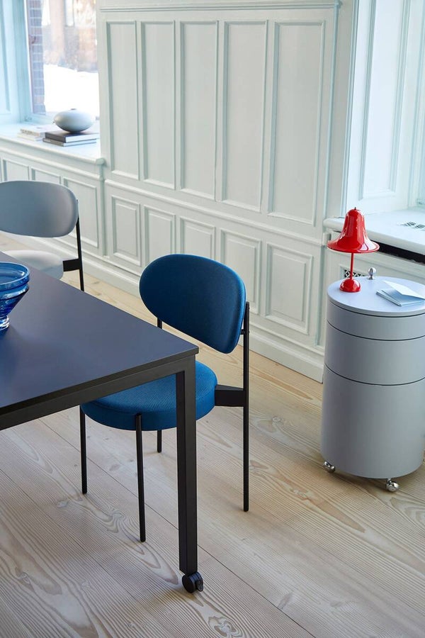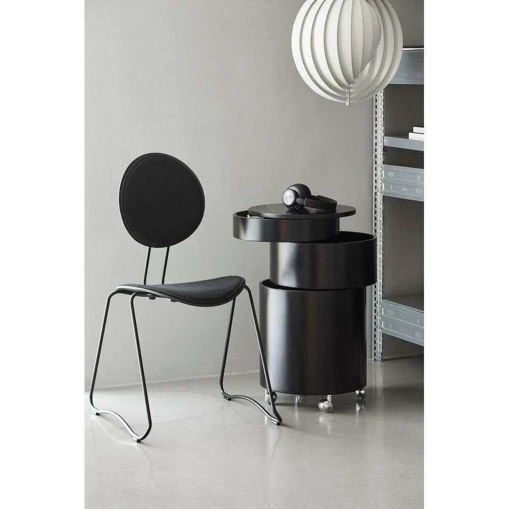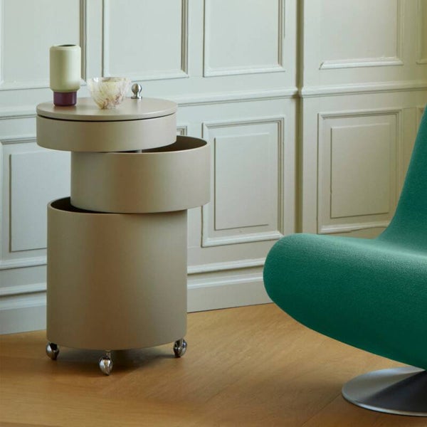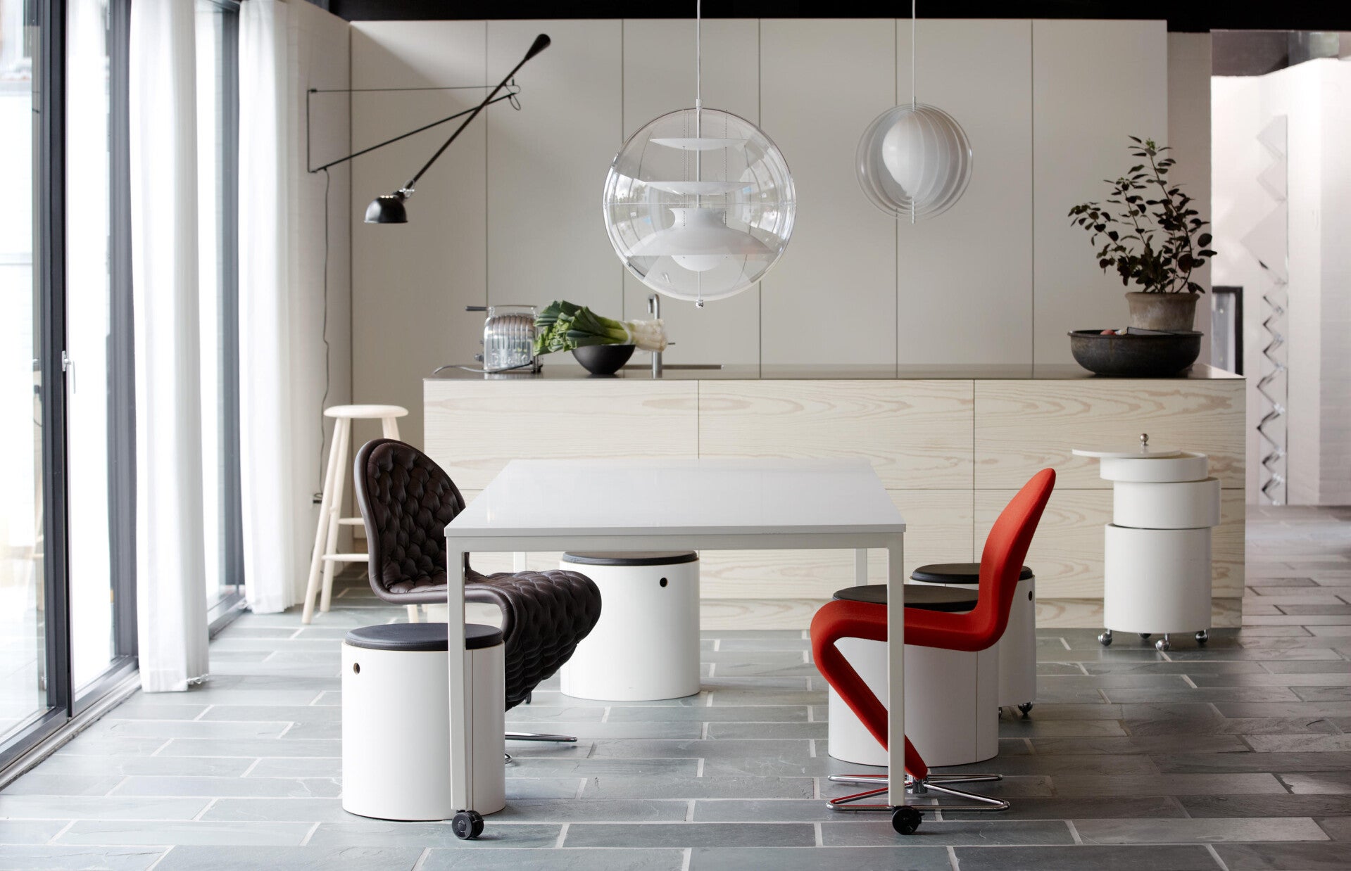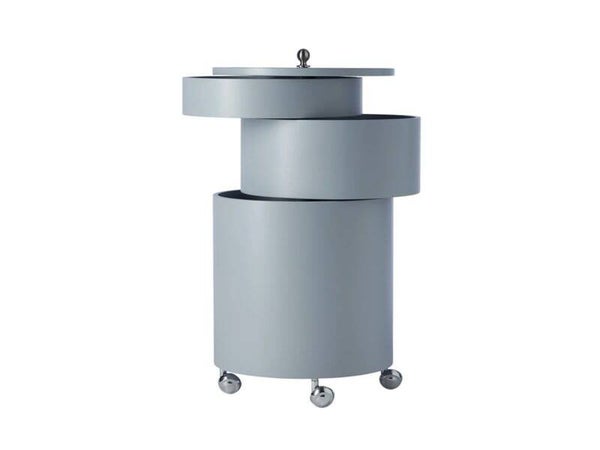 Als mooi contrast voegde Panton een chromen handvat op het deksel en chromen wielen toe om het ontwerp functioneler te maken.