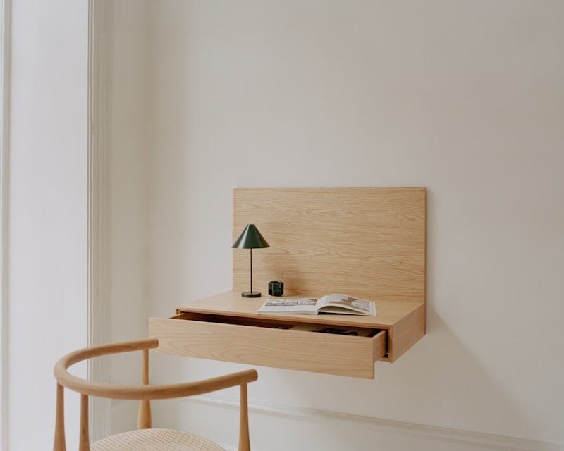 Prachtig wandbureau Tana met lade. Je kunt deze op een zelf te bepalen hoogte hangen, dus ook te gebruiken als kaptafel met poefje of als bartafel met barkruk. In eiken - walnoot of zwart gebeits eiken.