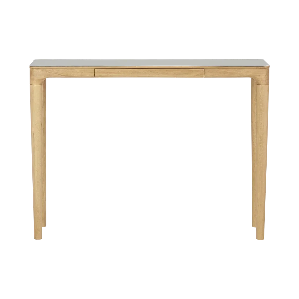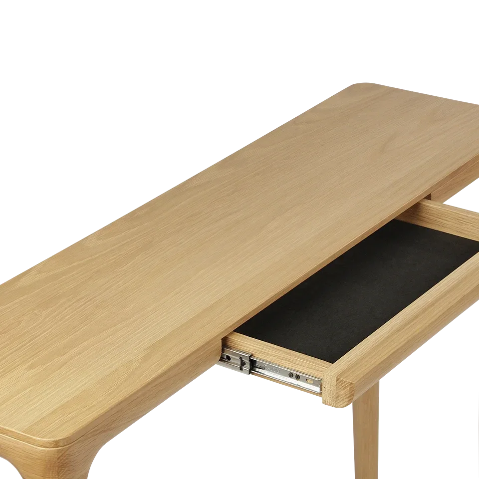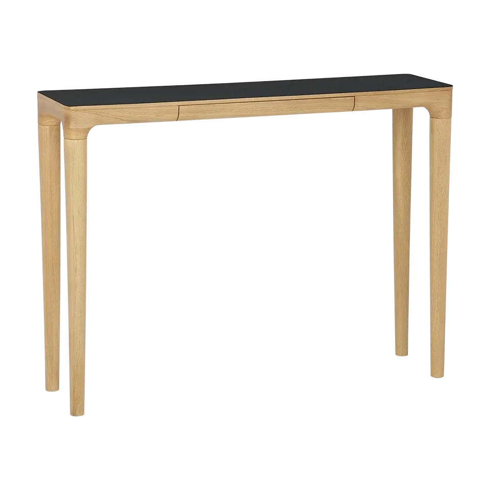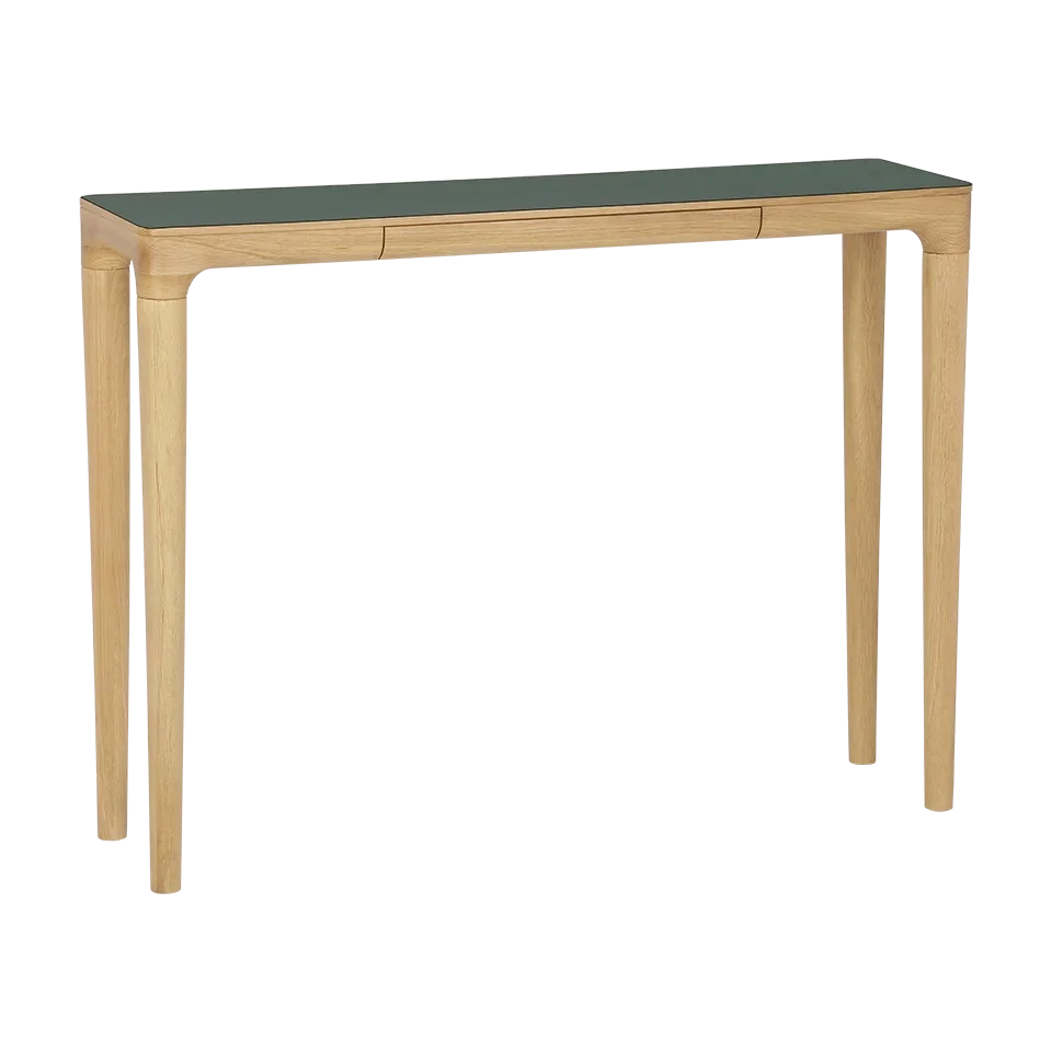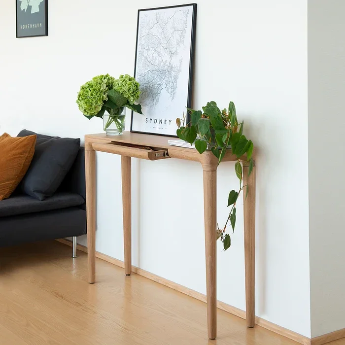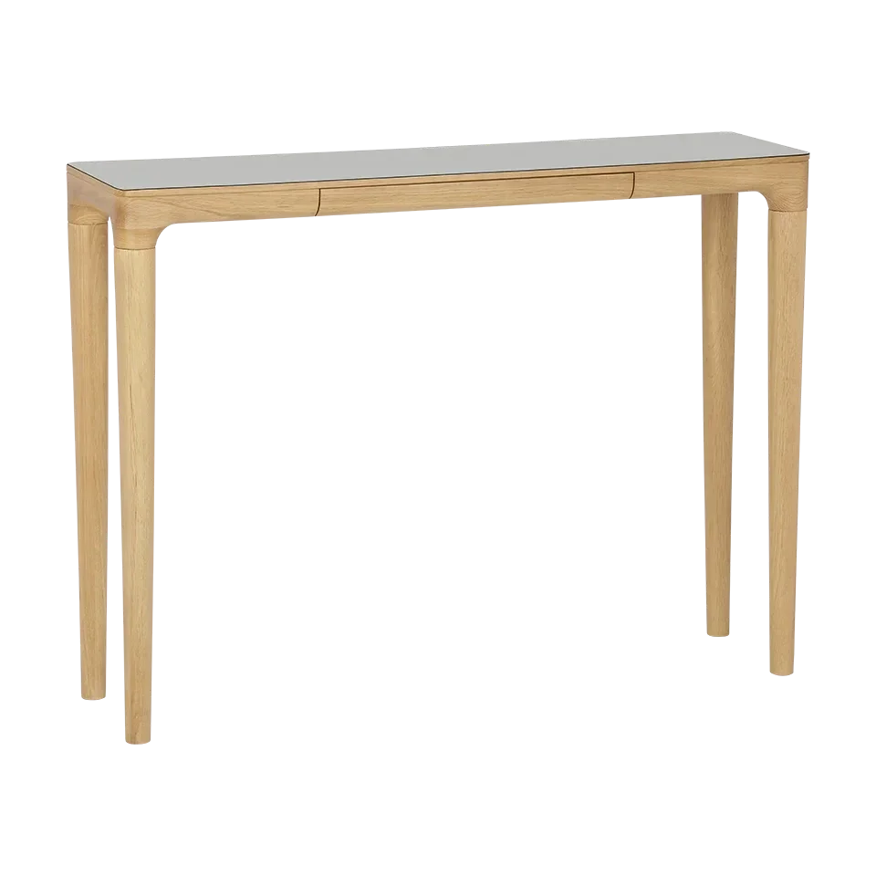 De stijlvolle en discrete consoletafel heeft een met stof beklede lade waarin u spullen, bestek, servetten of belangrijke papieren kunt bewaren.