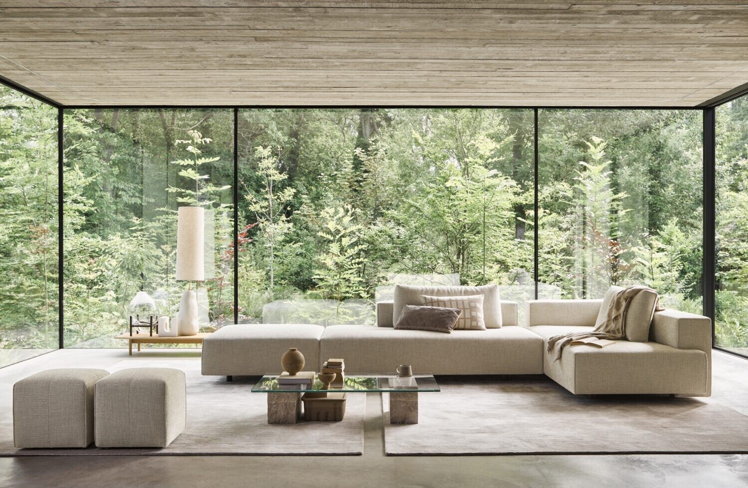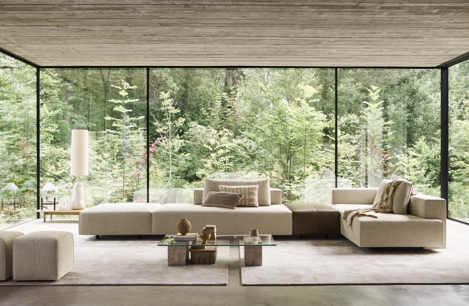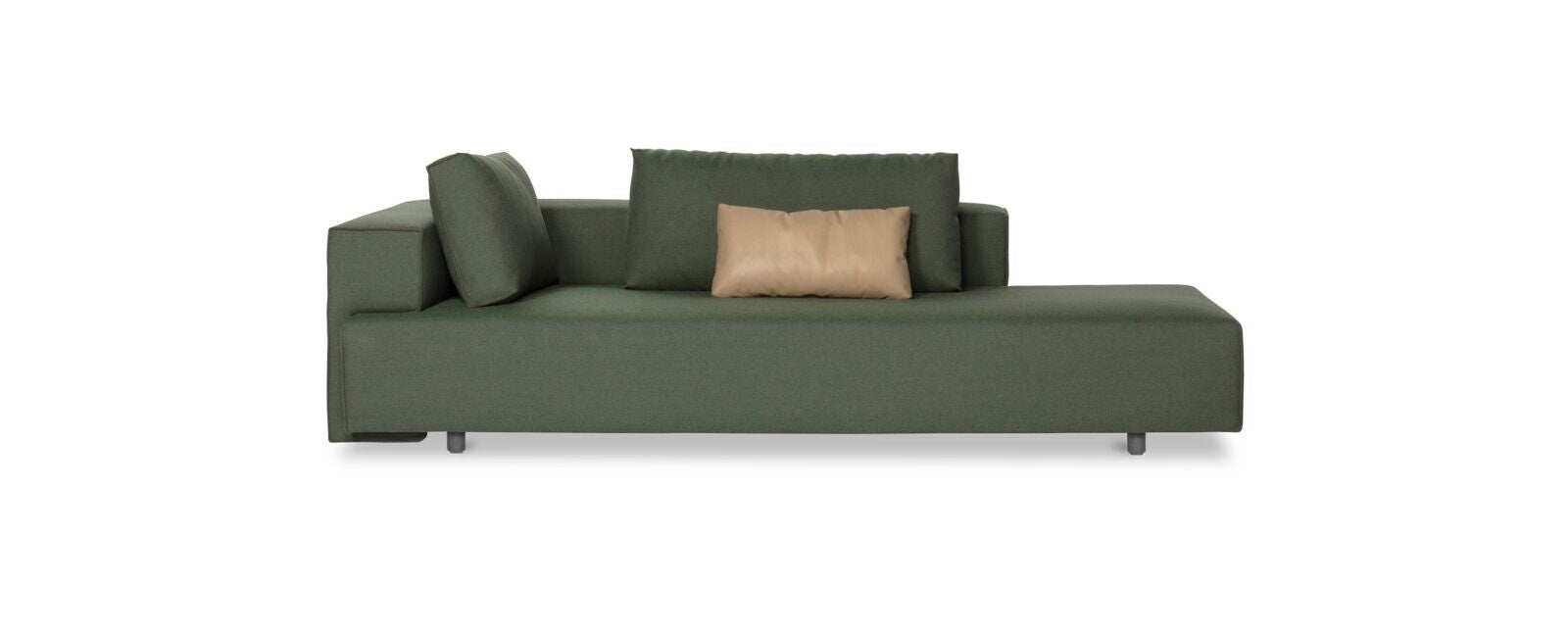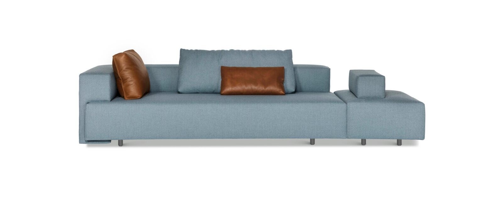Mooi is de geraffineerde detaillering van de bank, zoals de arm die zich om de zitting vouwt, de extra armlegger waarmee je een knusse zitplek kunt creëren en de stiknaad van de elementen die terugkomt in de rugkussens.