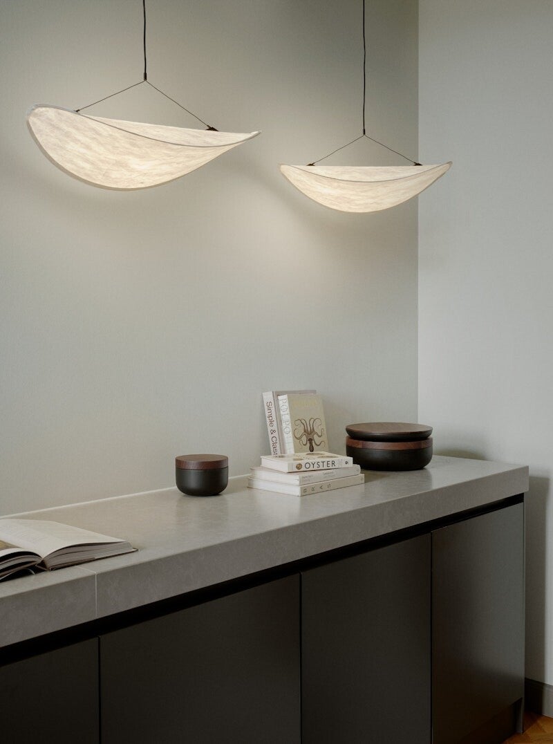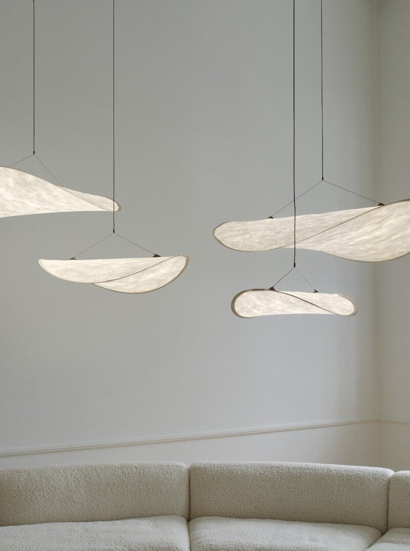 De Tense hanglamp, die zich uitstrekt tot meer dan een meter lang, lijkt alsof er een zachte wolk naar binnen is gedreven.