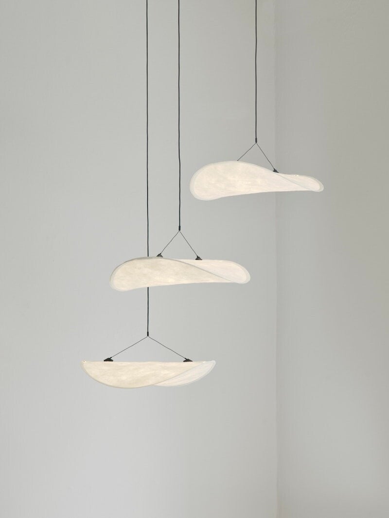 Drie schermen vormen een verenigd geheel en smelten samen tot een volumineuze maar gewichtloze uitstraling. Net als de kenmerken van de Tense-serie verspreiden deze kappen, gemaakt van Tyvek, een zachte lichtinval van zowel boven als onder.
