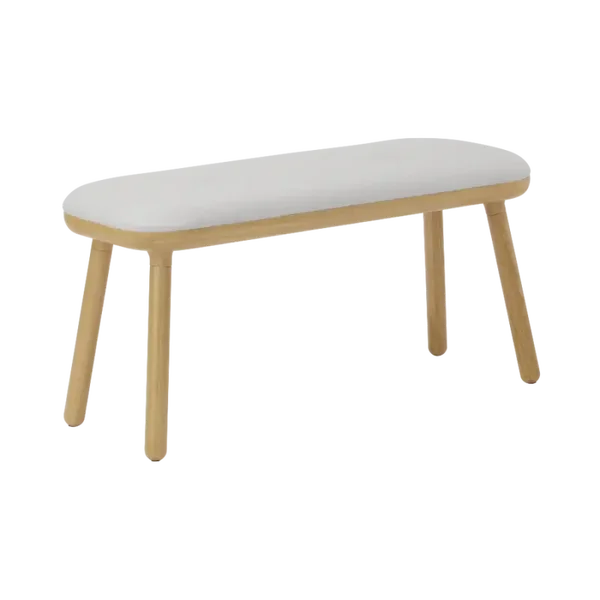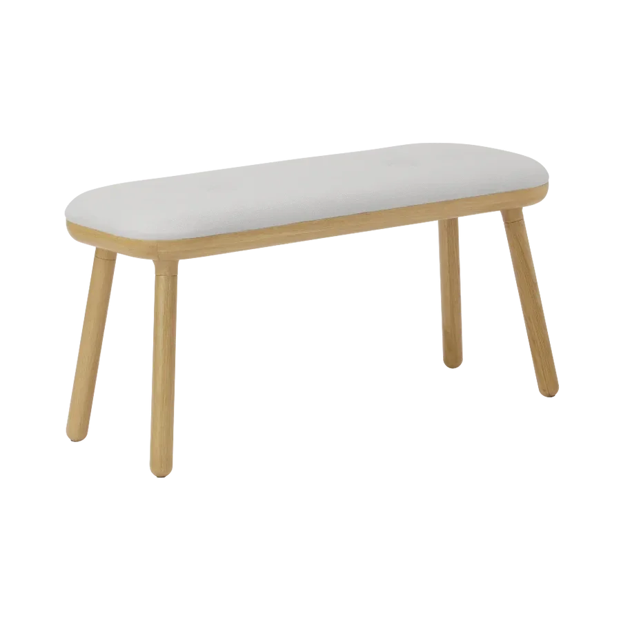 De bank heeft een massief eikenhouten onderstel en een gestoffeerde zitting, verkrijgbaar in de vier standaardkleuren van 100% gerecycled Horizons-textiel.
