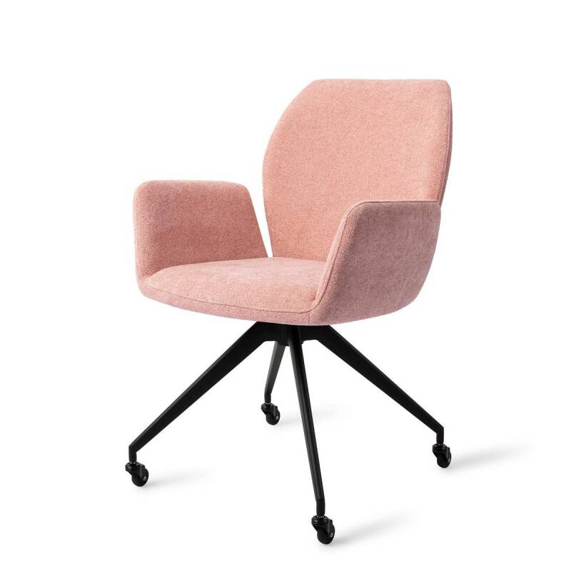 Wij zijn fan van dit ontwerp: het is strak en comfortabel. De stoel is bekleed met een duurzame polyester stof die in de verte iets wegheeft van een luxe badstof die heerlijk zacht oogt en voelt. En nu dus leverbaar met wielen!